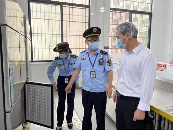 执法人员在学校食堂检查食品冷藏冷冻设备