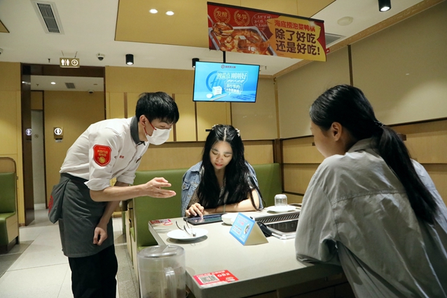 工作人员佩戴“光盘行动倡导员”袖章,主动提醒顾客适量点餐。(何正君 摄)