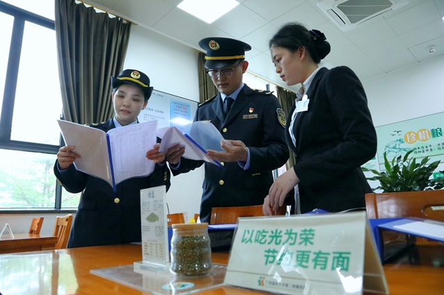 市场监管部门工作人员对相关台账进行检查,了解餐厅实施制止餐饮浪费措施的情况。(何正君 摄)