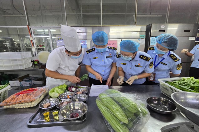 事前评估。执法人员主动与赛事餐饮承办酒店对接,从环境卫生、进货查验、食材“双锁管理”、从业人员健康管理等重点环节排查食品安全风险隐患、提出整改意见、跟踪整改情况。预审菜单。根据《运动员禁用、慎用食品名录》及《重大活动禁用慎用名单》对菜谱进行严格审核,调整运动员菜谱、严禁使用运动员高风险食材。驻点监管。在赛事期间实行24小时驻点监管,保障人员对定点接待酒店的食品采购验收、烹饪加工、食品留样、餐用具清洗消毒等开展全环节、全过程驻点监督,查验活动举办方采购的午餐包、茶歇食品等,督促接待酒店、食品生产及餐饮服务单位严格落实食品安全主体责任。技术保障。发挥食品安全快速检测的预检作用,对赛事使用的肉类、蛋类、蔬菜、水果等品种开展农药残留、肉类瘦肉精、鸡蛋新鲜度等项目快速检测,把好食品安全入口关。周边巡查。组织精干执法力量,分4组对赛道周边的食品经营单位、摊点进行监督检查,严厉查处无证经营、超范围经营等违法行为。
