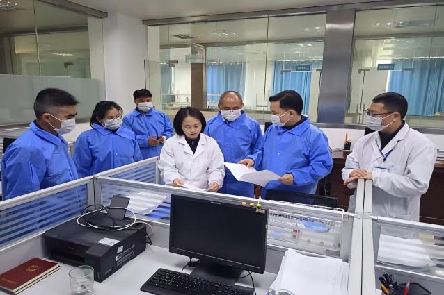 调研组一行直奔西林县食品药品检验检测中心实验室一线,实地查看场地环境、仪器设备配置及运行状态,详细询问检测项目覆盖范围、技术操作规范等核心情况,仔细翻阅西林沙糖桔、西林麻鸭等地标产品检测报告,并与检测人员亲切交流。