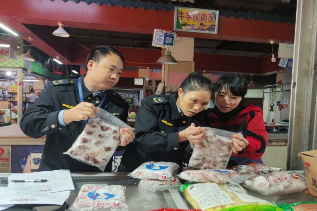 紧盯销售环节,排查隐患源头。西林县市场监管局对全县肉制品生产经营单位开展全面摸底排查,重点聚焦农贸市场、肉制品批发部、商场超市等关键区域,开展冷冻肉专项整治。执法人员严格核查经营主体资质、索证索票制度执行情况,重点核验《动物检疫合格证明》《肉品品质检验合格证》等凭证,并现场规范指导经营场所产品储存条件,严厉打击经营来源不明、未经检验检疫或检验检疫不合格、腐败变质肉类及肉制品等违法违规行为。