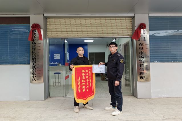 近日,柳城县东泉镇泉溪酒坊的酒坊主满面笑容地将一面写有“贴心服务为业主 服务高效办实事”的锦旗送给东泉镇市场监管所。这是东泉镇2024年的第一本《小作坊登记证》,也是东泉镇市场监管所为东泉镇小作坊送上的第一份新年祝福。