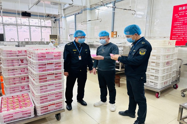 在流通环节,执法人员在辖区内超市、农贸市场、美食街、糕点店、小型食品店等销售场所开展“地毯式”排查,执法人员询问商家进货渠道,仔细查看各商家的进货台账、索证索票,严格查验芝麻饼包装标识,确保生产日期、保质期、配料表、生产厂家、联系地址等关键信息清晰完整。除此之外,执法人员还对芝麻饼的色泽、形态、气味等感官环节进行细致甄别,排查是否变质、异味等异常情况,同时随机抽查相应批次检合格报告,确保销售环节来源正规,杜绝“三无”产品流入市场。