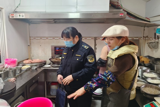 食品安全“回头看”,守牢舌尖防线。2月7日,在上思县江滨路,执法人员深入名味美食楼等多家复工餐饮单位进行“回头看”,重点查看各餐饮单位进货查验制度是否落实到位、操作间环境是否干净卫生、食品贮存条件是否符合要求、食品加工制作流程是否安全规范、餐饮用具清洗消毒是否到位、从业人员的健康证是否在有效期内等情况,确保后厨和餐厅清洁卫生、食材新鲜,无腐败、变质、过期的食品。