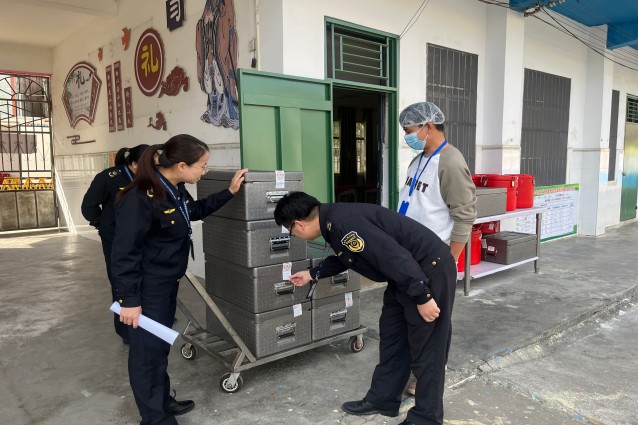 由于校内无水厨房尚未投入正式使用,谭礼小学目前采用灵山县魅荔之鲜餐饮服务有限公司统一配送的营养餐保障学生餐食供应。执法人员随机开展营养餐配送环节检查。在配餐接收区,执法人员仔细检查配送食品保温箱封签完整性、菜品出厂时间与运输时长、餐箱餐盒密封状况和食品中心温度等关键指标,确认每项都符合规范要求;另一方面指导学校相关负责人做好验收工作,对照配送清单逐一核对当天菜品,做好温度数据、食品留样等记录。