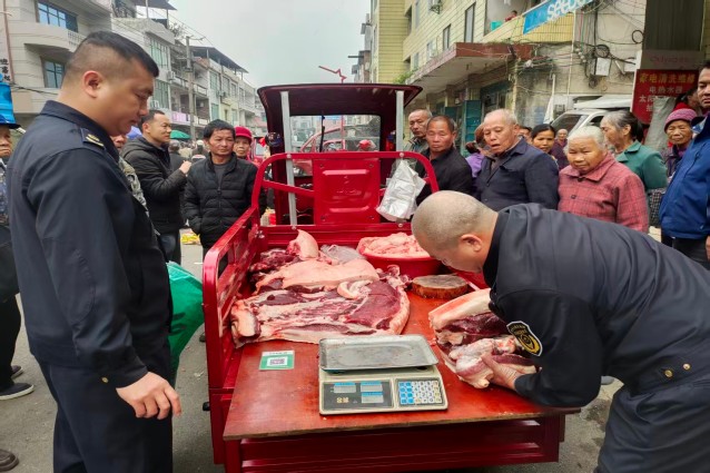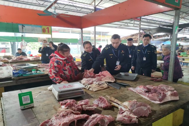食安系民生,监管护万家。近日,柳城县市场监管、公安、农业农村、龙头镇政府联合,走进龙头镇农贸市场,对"白板肉"开展靶向整治,以铁腕合力肃清乱象,让优质放心肉稳稳托住农村群众"舌尖上的幸福"。