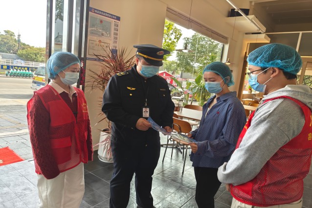 执法人员和志愿者向商家进行反餐饮浪费宣传