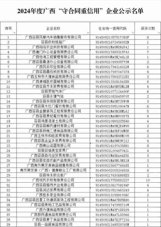 近日,广西壮族自治区市场监管局公布2024年度广西“守合同重信用”企业名单,容县39家企业上榜,彰显了当地企业扎实的诚信根基与良好形象。