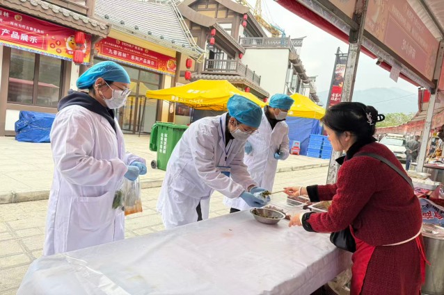 工作人员对美食街临时摊点食材进行抽样检测