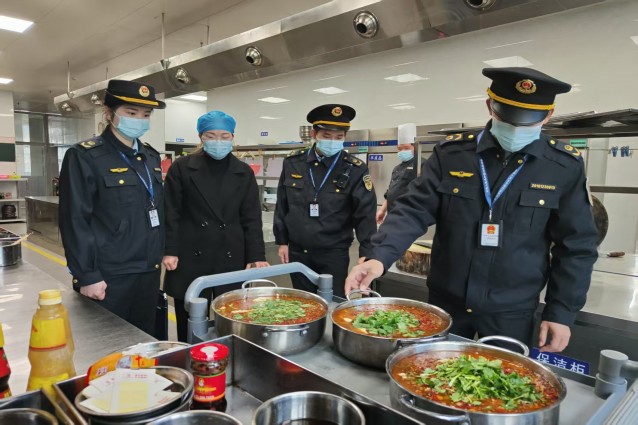 执法人员深入餐饮单位后厨,现场查看原料处理、烹饪操作及卫生规范落实情况