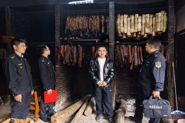 执法人员检查腊肉小作坊