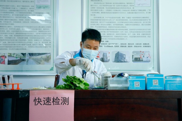 第三方食品检测机构工作人员对从学校食堂选取的食用农产品进行农药残留快速检测