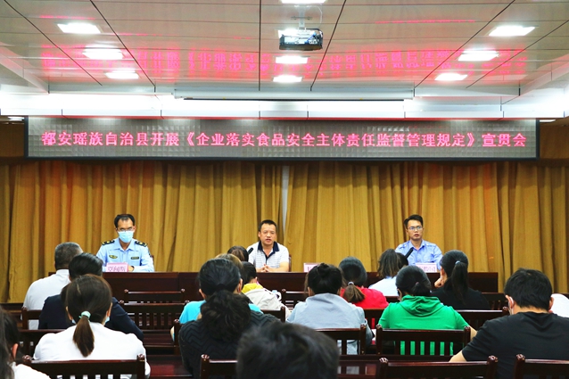 为贯彻落实国家市场监管总局令第60号《企业落实食品安全主体责任监督管理规定》(以下简称《规定》)精神,进一步压紧压实食品安全属地管理责任和企业主体责任,推动“两个责任”工作机制落地见效,11月1日,都安瑶族自治县食品安全委员会办公室组织召开食品生产企业落实企业主体责任宣贯会议,全县65家食品生产经营企业、供餐单位负责人参加会议。