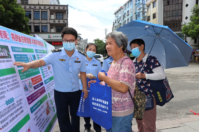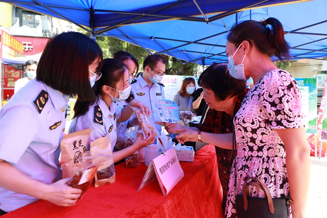 活动当天,灵山县市场监管局、县卫健局、县农业农村局等县食安委各成员单位紧紧围绕食品安全宣传周主题开展系列宣传活动:向群众和周边食品经营者发放食品安全知识手册、保健食品知识科普、特殊食品安全知识等宣传手册,普及食品安全知识,提高群众和相关经营者食品安全意识;通过展板展示,向群众宣传食安创城工作的重要性,进一步提高群众知晓率,引导群众支持和参与创建工作。此外,灵山县市场监管局还设置假冒伪劣产品展示区,为群众讲解查看产品包装标识、食品标签,如何避免购买到不合格产品,提升群众辨假识假能力;设置“你点我检”快检台,义务为群众提供来的食品进行快检,让群众现场观摩检测过程、知晓检测结果,进一步激发群众参与到食品安全社会共治中的热情。