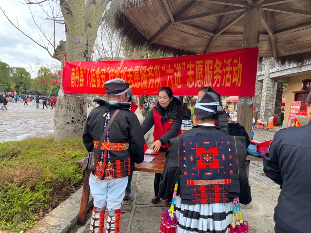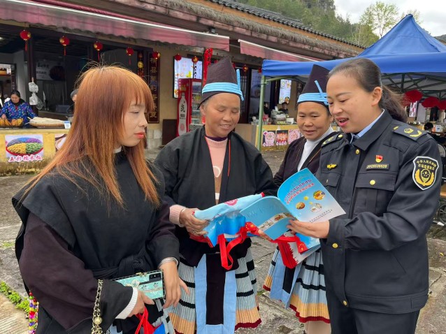 3月3日,南丹县举办一年一度的白裤瑶族年街节活动,白裤瑶寨内热闹非凡、铜鼓阵阵,各地游客与当地白裤瑶同胞纷纷前来参与。南丹县市场监管局组织执法人员及“八桂食安”桂姐姐志愿服务队深入活动现场,开展食药知识宣传活动。