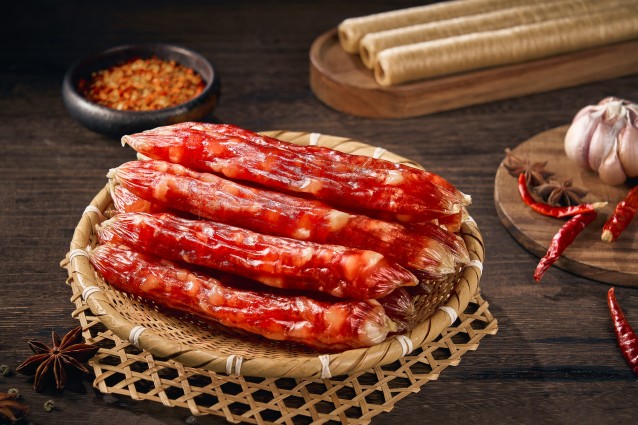 地道梧州风味与广东腊肠同宗不同源,梧州腊肠历史悠久,上可追溯至清光绪二十六年的“良田腊味”。制作时讲究“三味三香”:豉味(酱油香)、香味(酒香)、风味(腊味香),包裹腊肠的肠衣要求薄细、均匀,制作时“灌得满、斟得匀、绑得紧”。