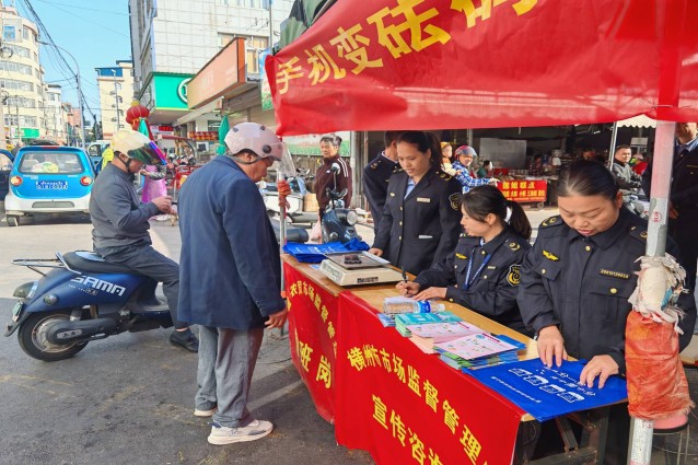 11月26日,横州市市场监管局联合横州市综合检验检测中心到城北农贸市场开展 “手机变砝码,计量惠民生” 宣传活动。