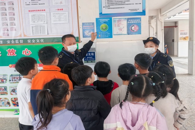 工作人员向孩子们介绍食堂食品安全信用等级情况